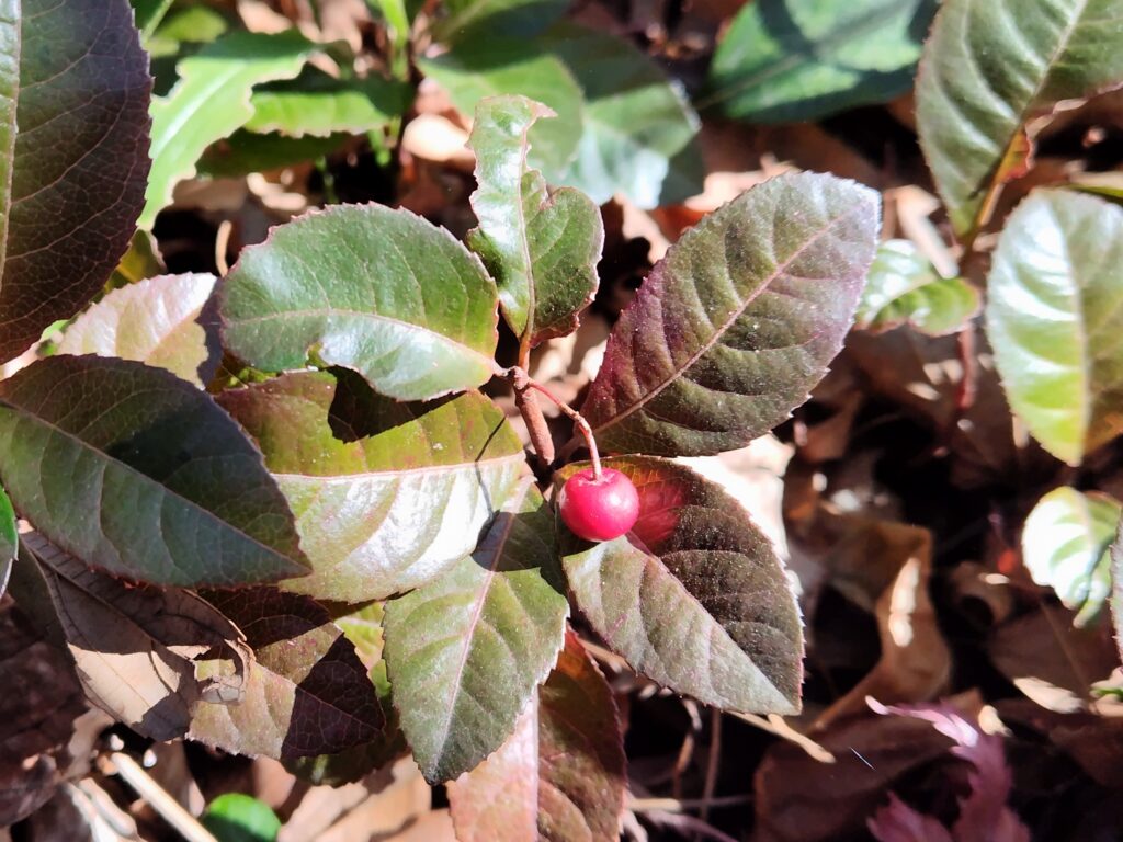 ↑ヤブコウジの実。とても背が低い植物なのでよく見ないと実は見えないことが多いです。