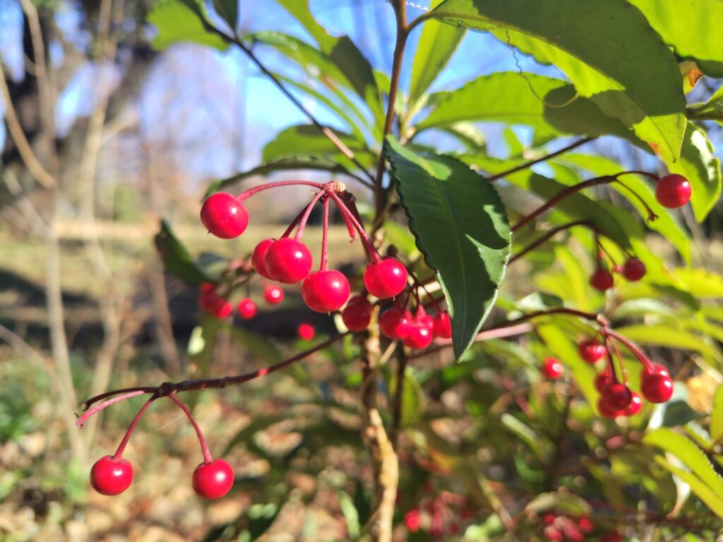 年の瀬を迎え慌ただしく過ごされている方も多いのではないでしょうか。お正月のお花と言えば「千両」ですね。赤い実には魔除けの意味があると言われ玄関の横などに赤い実のつく植物を置くことがあります。南天などがその一つです。諸説ありますが、お正月のお花に赤い実を入れるのも縁起物であることや魔除けの意味があります。そこで、この時期に見られる赤い実が付く植物をいくつかご紹介します。