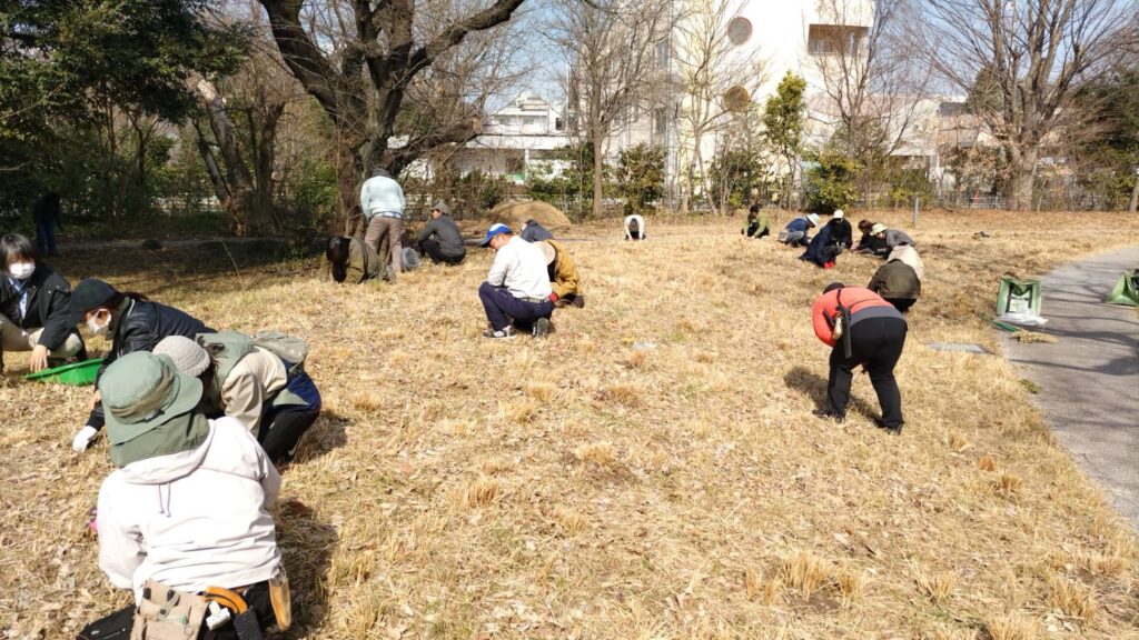 説明を聞きながら園内を一周したら、1種類か2種類、ターゲットの外来種を決めて皆で選択除草をします。この日は、冬の時期に抜いてしまいたい「ハルジオン」「ヒメジョオン」を除草しました。ハルジオン、ヒメジョオンは冬場は“ロゼット”という地面に這うように放射状に広がった状態で生えているのですが、他の植物もまだあまり出てこないこの時期は除草にピッタリのタイミングなのです。