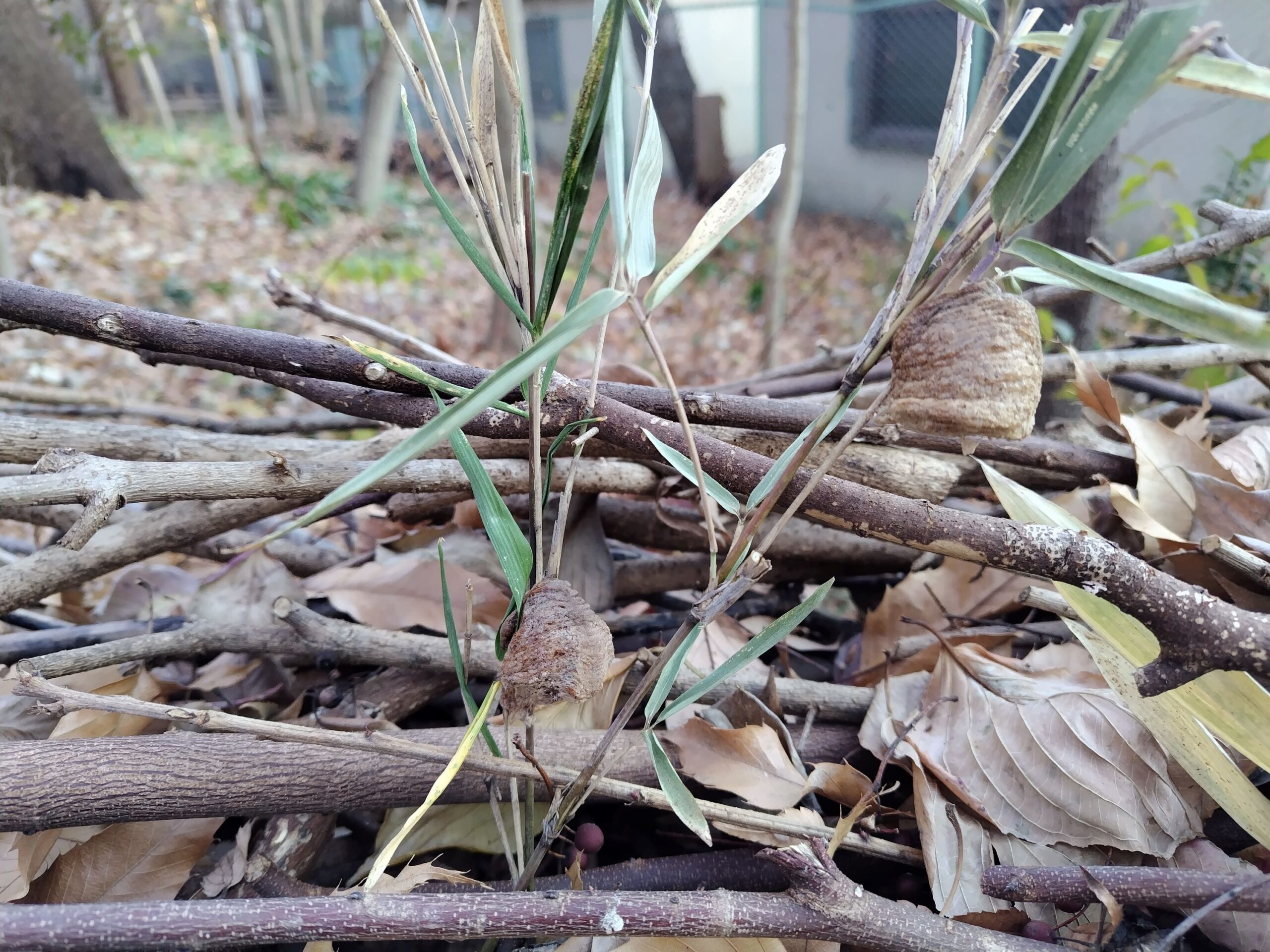 今年も作業中に沢山のカマキリの卵に遭遇しました。カマキリがどの高さに卵を産むかによってその年の降雪量が多いか少ないか予想ができると言われていますが、果たして今年はどうでしょうか?ちなみに去年は少し高い位置についていたので「今年は雪が多いかもね!」という話をしていましたが全然降りませんでした。カマキリ予報、ハズレです。今年は低い位置に多いので暖冬かもしれませんね。笹刈りの際に卵がついているのを刈ってしまった際には写真のようにバイオネストの脇などに刺して保護しています。今シーズンの降雪量はどうなるのかちょっと楽しみです。