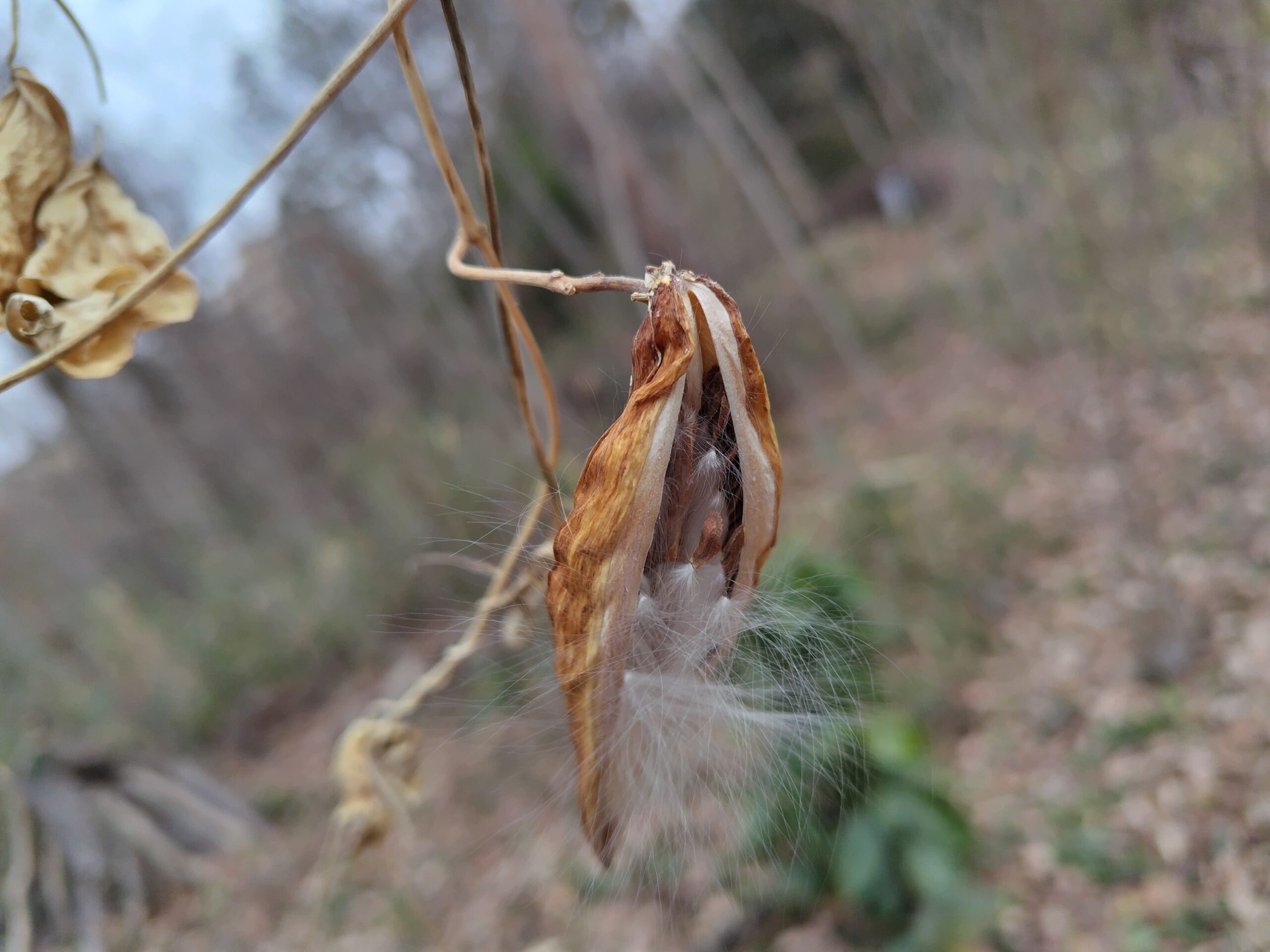 草花ガガイモの実が割れて中の種が飛び始めています。フワフワした綿毛がとても綺麗ですね。以前青い実を割った状態のものを記事に載せましたが、今回は自然な状態で開いたものを載せました。このフワフワした毛は、かつて綿の代わりに使われたこともあるそうです。