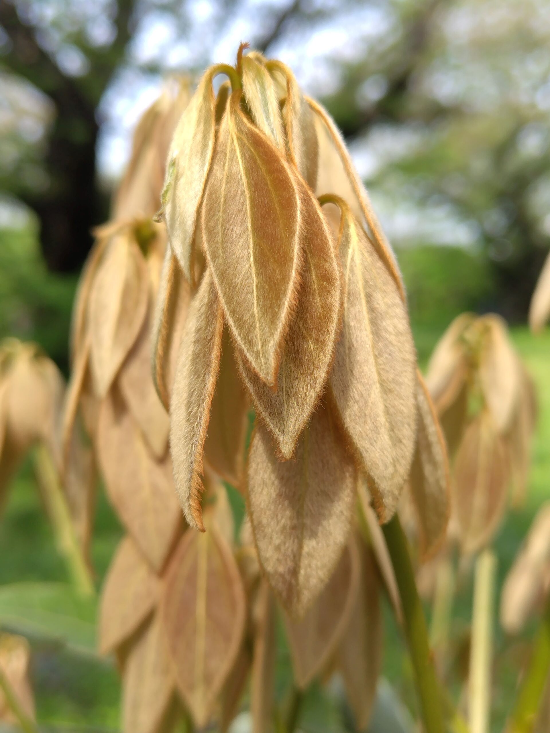 4月頃に茶色い新芽が出てくるのですが、この新芽が柔らかいうちだけベルベットのような手触りを楽しむことができます。植物は触られると「触られたぞー」という危険信号を仲間に伝えるシステムがあるそうなので、あまり触り過ぎると植物にとってストレスになってしまいますが、この時期しか感じられない独特な手触りをぜひ楽しんで頂きたいです。シロダモの新芽を見かけたら少しだけ触らせてもらってください。