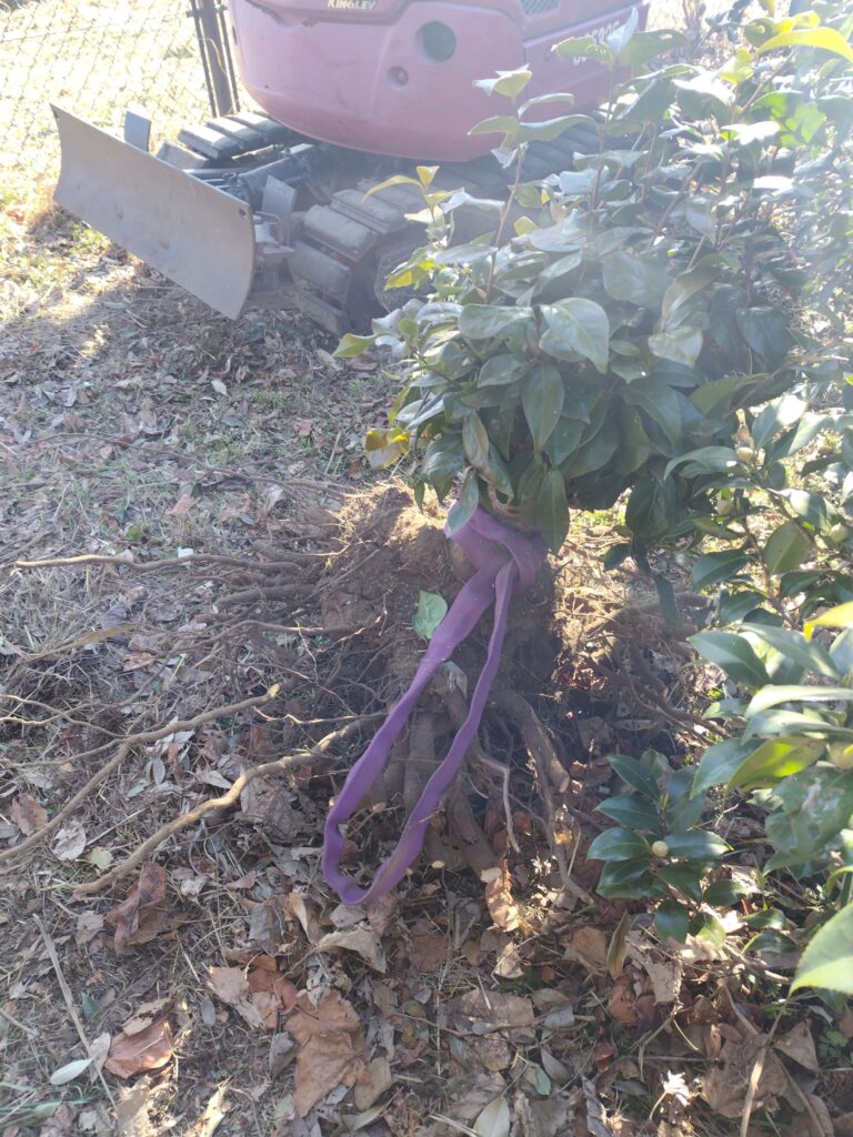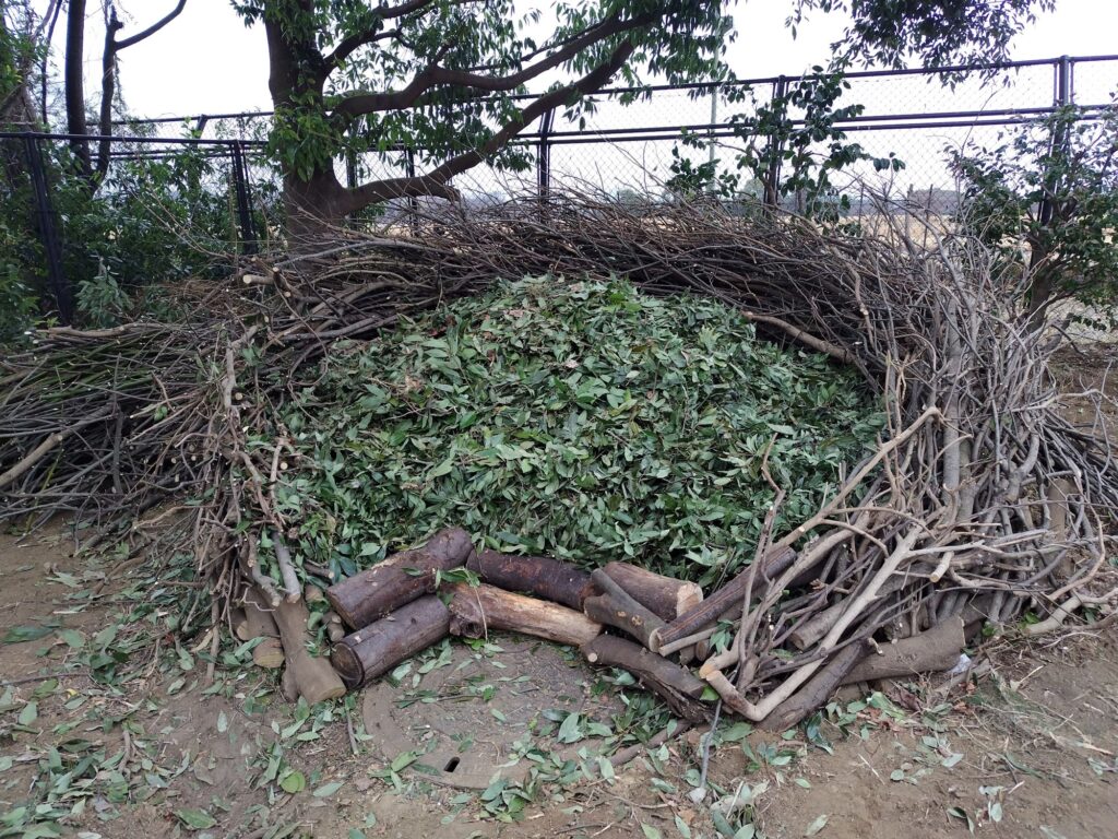 重機を使って元々植わっていたツバキを移植、剪定しました。シラカシとツバキの剪定で沢山枝が出たのでそれを利用してバイオネストの枠を作成します。枠に使えない細かい枝や葉はバイオネスト内部に入れて刻み堆肥にしていきます。