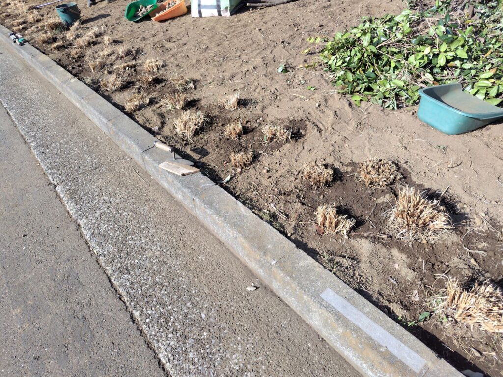 園路際にはチカラシバを植えました。整地するにあたり土の中から出てきた沢山の石なども再利用していきます。この空間が今後どうなっていくのか作業している私達もとても楽しみです。変化していく様子をぜひお楽しみに!