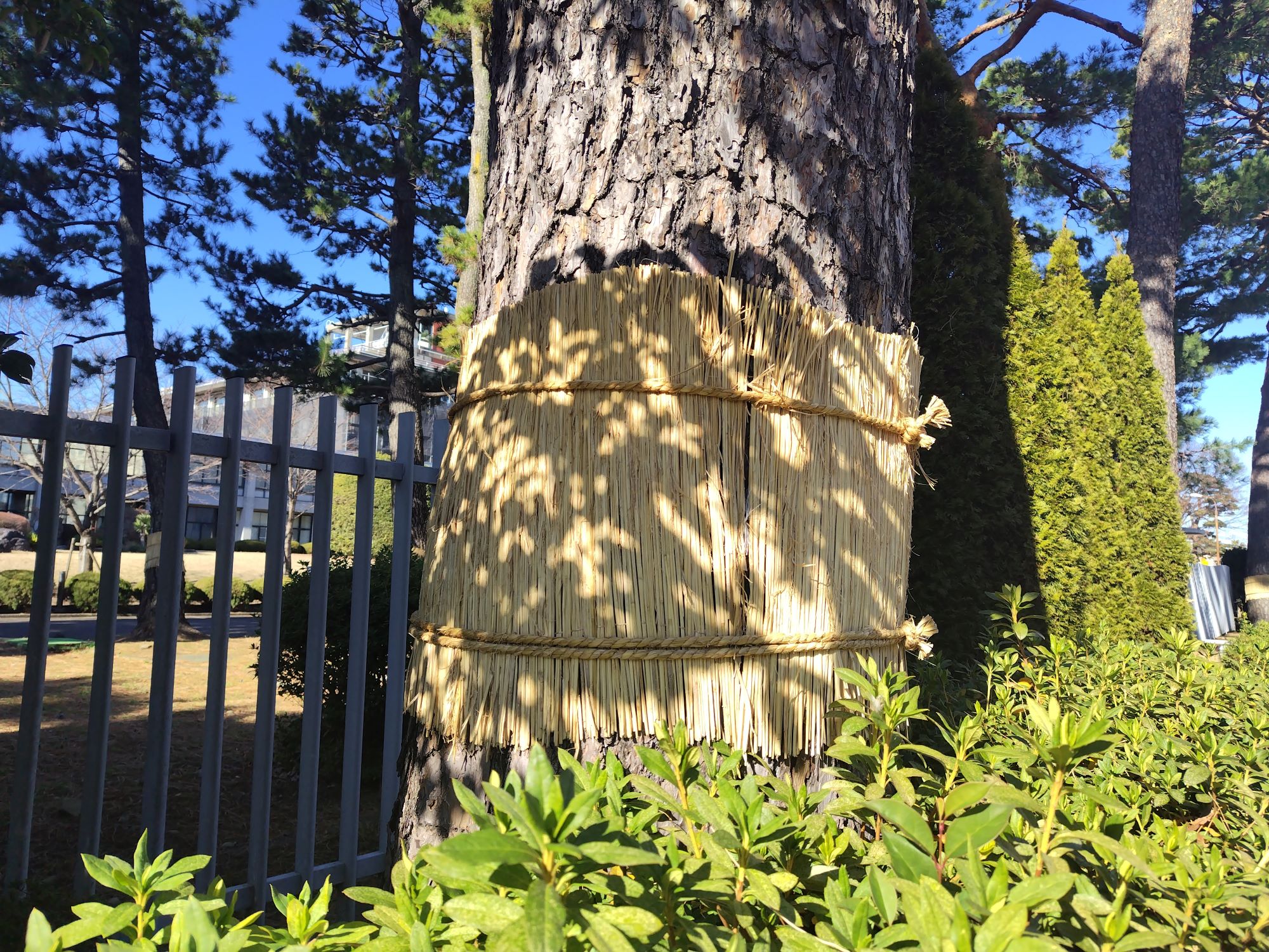 樹木事務所に行くのに歩いていたら松の菰巻き(こもまき)を見かけました。なんだか腹巻のようなこの姿。冬の間にこの幹の周りに巻いた菰に虫の幼虫が集まり、春になったら菰ごと駆除するという日本の伝統的な虫退治の方法です。ただ近年ではその効果は賛否両論あるところ…とのことですが、冬の風景としては残ってほしいと思います。